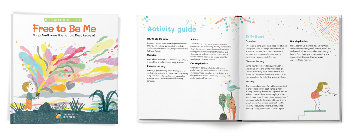 The Sunflowers wrote upbeat melodies and accessible lyrics in Free to Be Me to help budding language learners discover how to share their feelings, hopes, and dreams. The musical picture book features the illustrated lyrics of each song, followed by activity ideas for teaching English. Here’s a look at the activity prompts for “Be Brave Not Afraid.” This empowering ditty offers children a vocabulary for bravery. It’s normal to be afraid sometimes, but we can also be calm, strong, and brave in all sorts of ways.