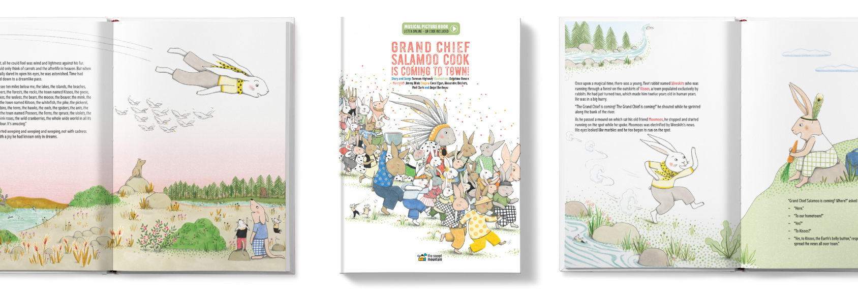Written in English, the story features several Cree terms and is accompanied by nine jazzy songs performed in Cree. “It’s fun, it’s funny, and it has just enough Cree language to be warm and inviting for young learners, whether or not you speak Cree,” says singer-songwriter Buffy Sainte-Marie. Readers can look up words in the glossary at the end of the book and learn how to say them with pronunciation videos recorded by Tomson Highway. Find the videos in the Resources section of our website and on our YouTube channel. The French version of Grand Chief Salamoo Cook Is Coming to Town, published by La montange secrète, is available here.