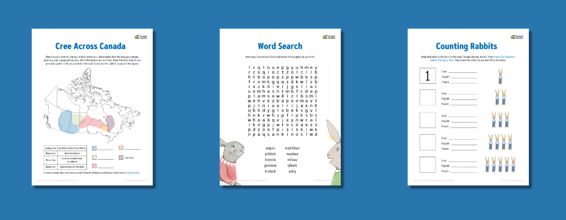 In collaboration with Arden Ogg from the Cree Literacy Network, The Secret Mountain has also developed a free teaching guide and activity sheets. The teaching guide includes several “bite-size” Cree lessons written in Standard Roman Orthography, which uses letters of the English alphabet to replicate Cree language sounds. Lessons include vocabulary and counting exercises, as well as grammatical ideas like animacy and pluralization. Download the free teaching guide for Grand Chief Salamoo Cook Is Coming to Town here: Teaching Guides. You can also browse and download individual activity sheets here: Activity Sheets.