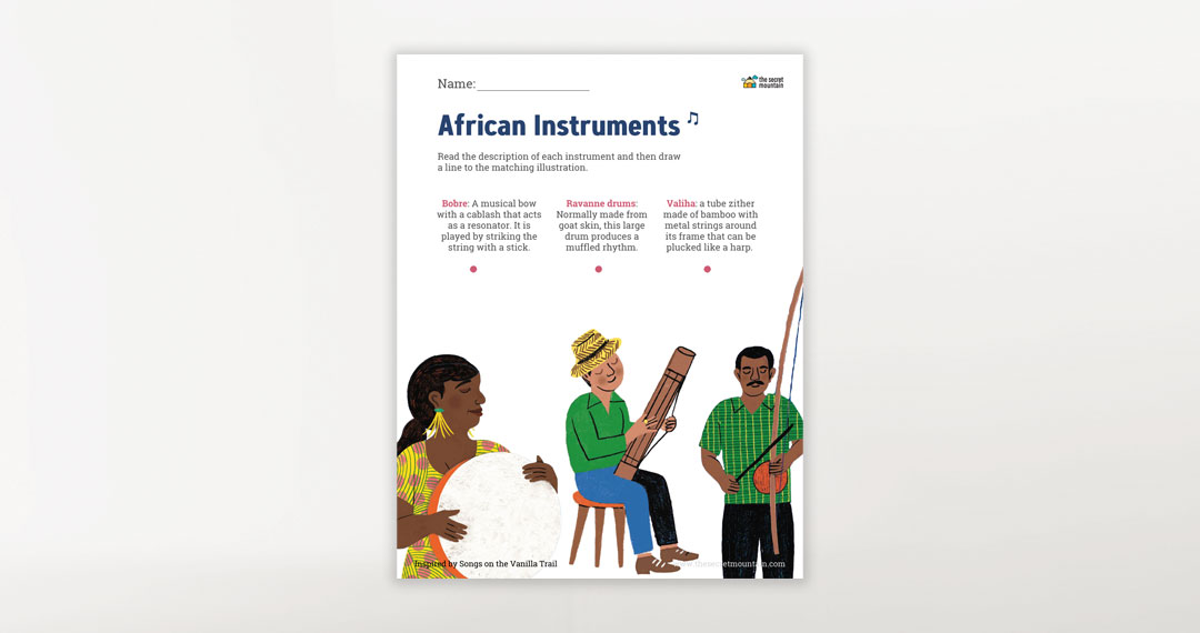 African Instruments Read the description of each instrument from Songs on the Vanilla Trail and then draw a line to the matching illustration.