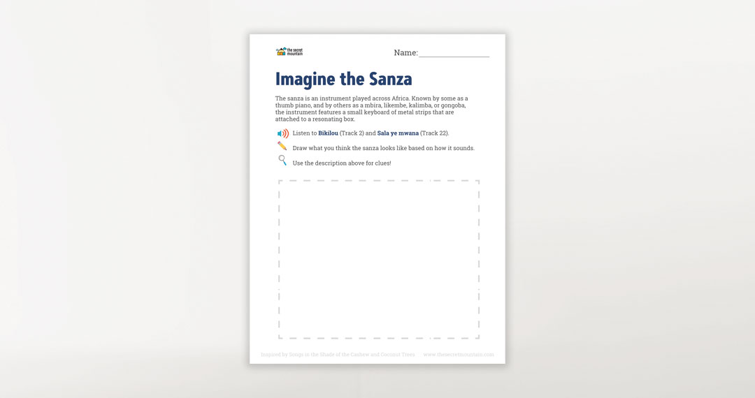 The sanza is an instrument played across Africa. Listen to Bikilou (Track 2) and Sala ye mwana (Track 22) in Songs in the Shade of the Cashew and Coconut Trees and draw what you think the sanza looks like based on how it sounds.