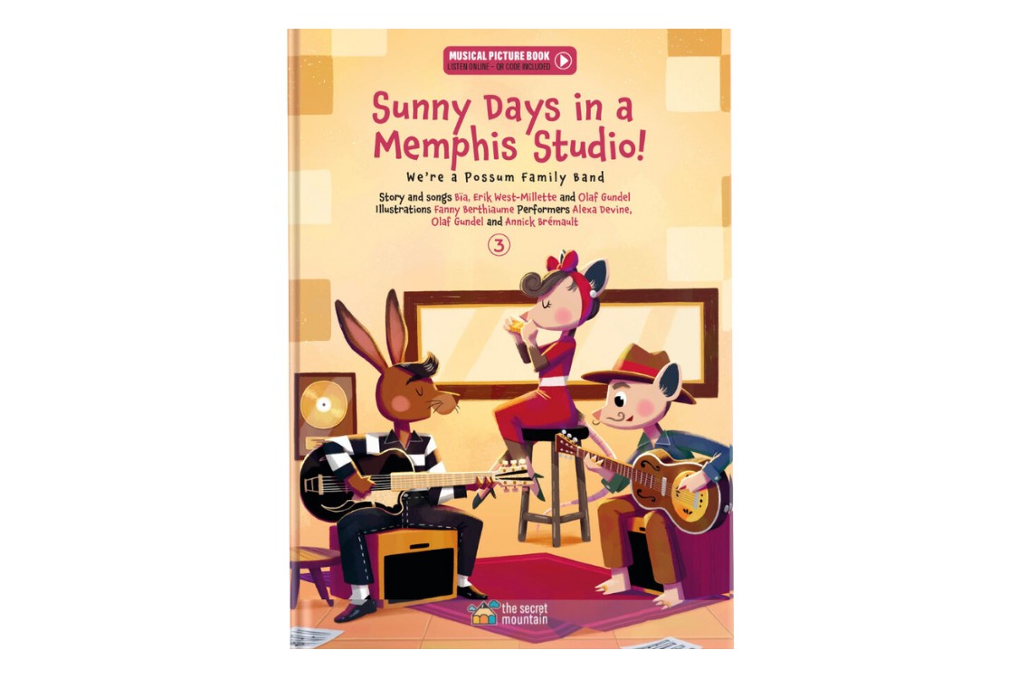 Sunny Days in a Memphis Studio! is the third story in the We’re a Possum Family Band series, which follows Mama and Papa Poss on their travels across North America to the birthplaces of Cajun, jazz, country, rock ‘n’ roll, blues, and traditional Quebecois music. At the end of each story, explanatory notes delve into the key figures, instruments and customs behind each genre.
